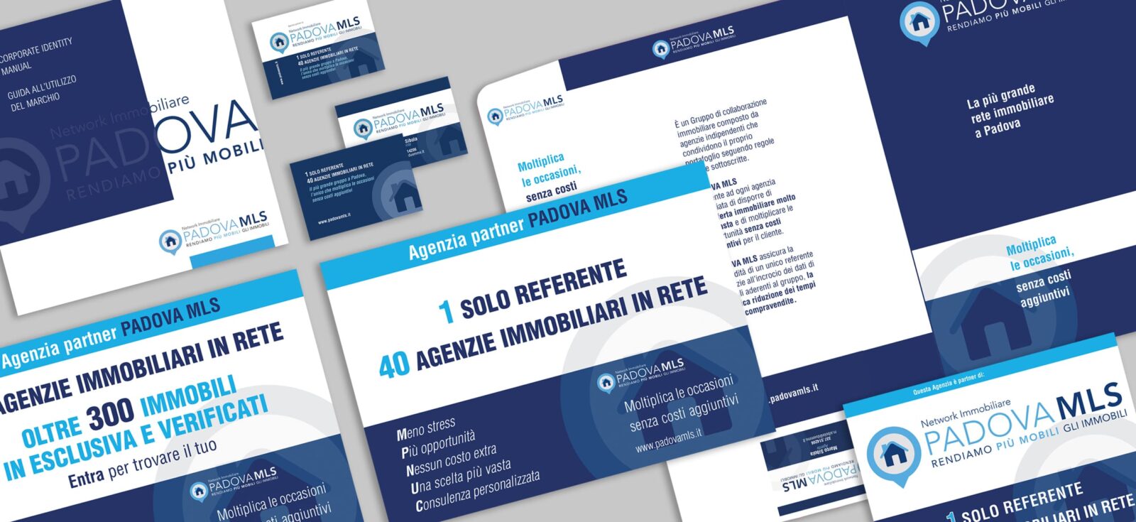 Successivamente abbiamo prodotto il Manuale d’Uso, una sorta di vademecum contenente le linee guida relative all’utilizzo del logo, e iniziato a riprogettare l’Immagine Aziendale partendo dai biglietti da visita, la cartellina e i cartelli vetrina.